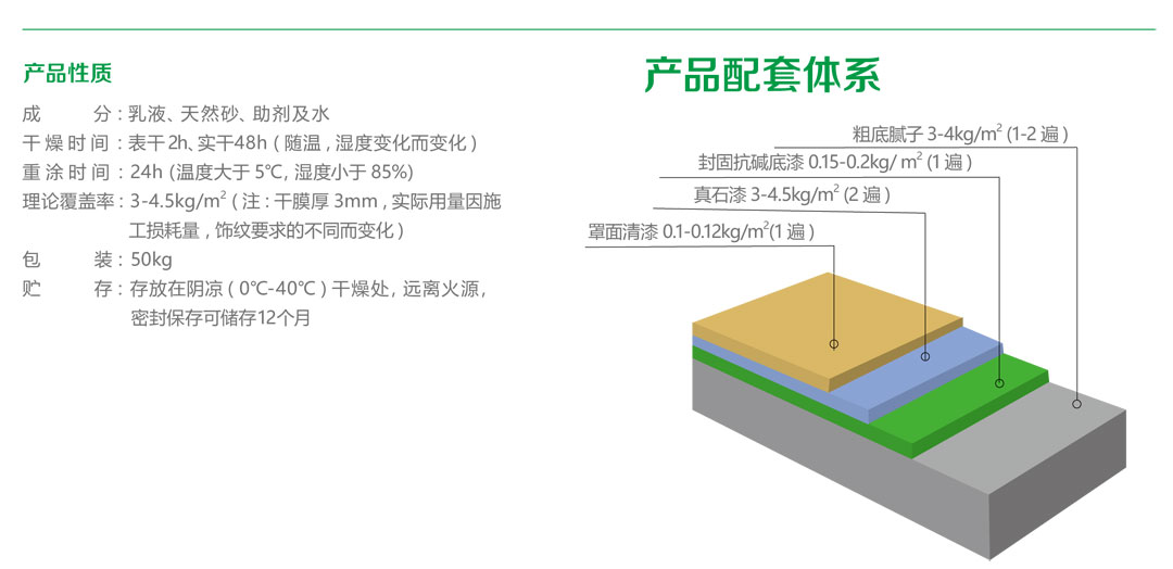 天然真石漆是由環(huán)保型高分子乳液聚合物和能構(gòu)成仿石材紋理的天然大理石骨料、助劑等材料組成的厚質(zhì)涂料 , 其外觀如石頭一般自然、穩(wěn)重、氣派并且附著牢固 , 具有優(yōu)異的耐候性、憎水透氣性、柔韌性和抗沖擊性 , 符合國家規(guī)定的 JG/T24《合成樹脂乳液砂壁狀涂料》標準。其裝飾性具有很強的仿石材及歐式風格效果 , 是當今社會高檔小區(qū)、別墅、公共建筑的主流裝飾材料。適用于所有平整的建筑物內(nèi)、外墻礦物質(zhì)材料基層 ,同時也是外墻外保溫體系理想的面層裝飾材料。